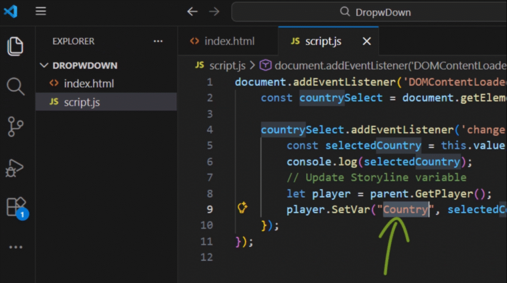 Create a text variable in Storyline. This will store the selected dropdown value.