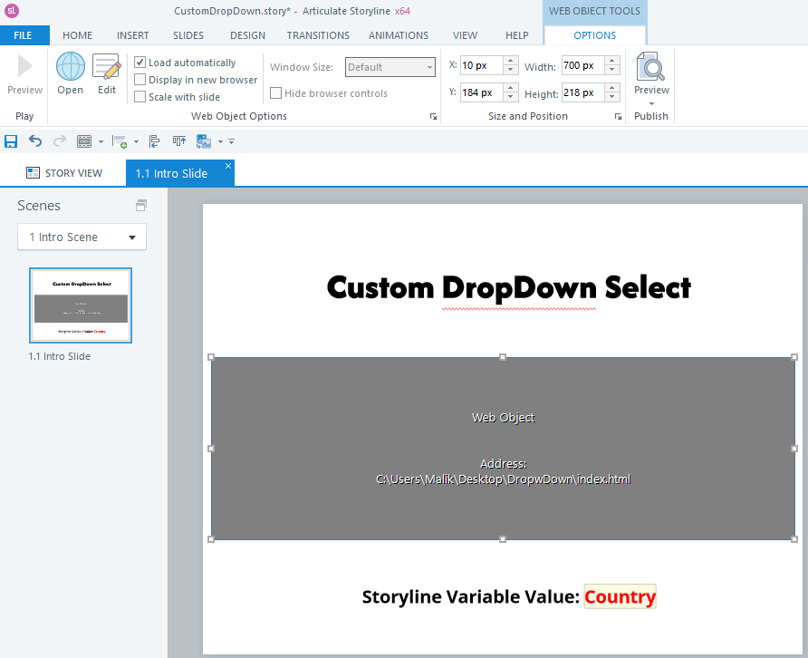 Insert the folder as a WebObject in your Storyline slide. Position and resize it as needed. The dropdown will automatically send the selected value to your Storyline variable.